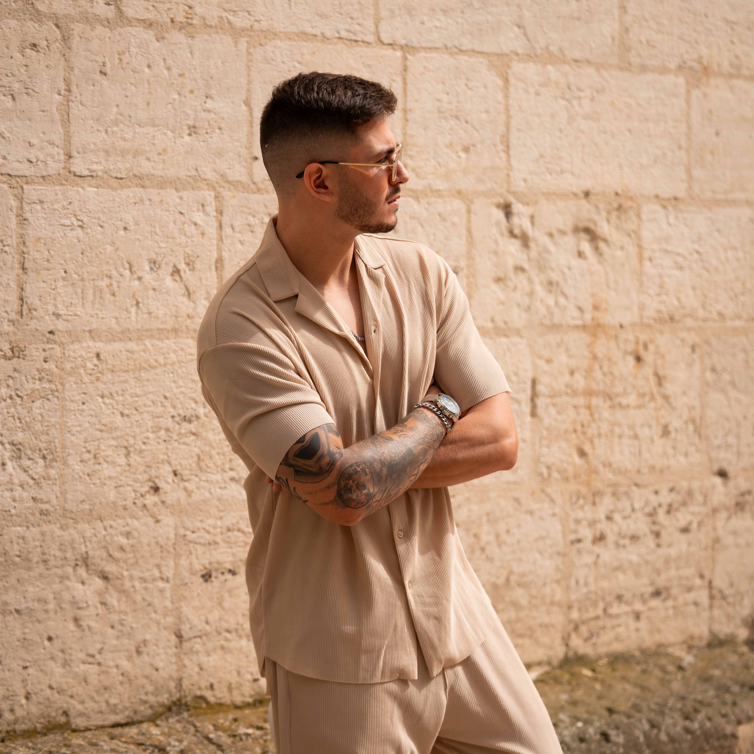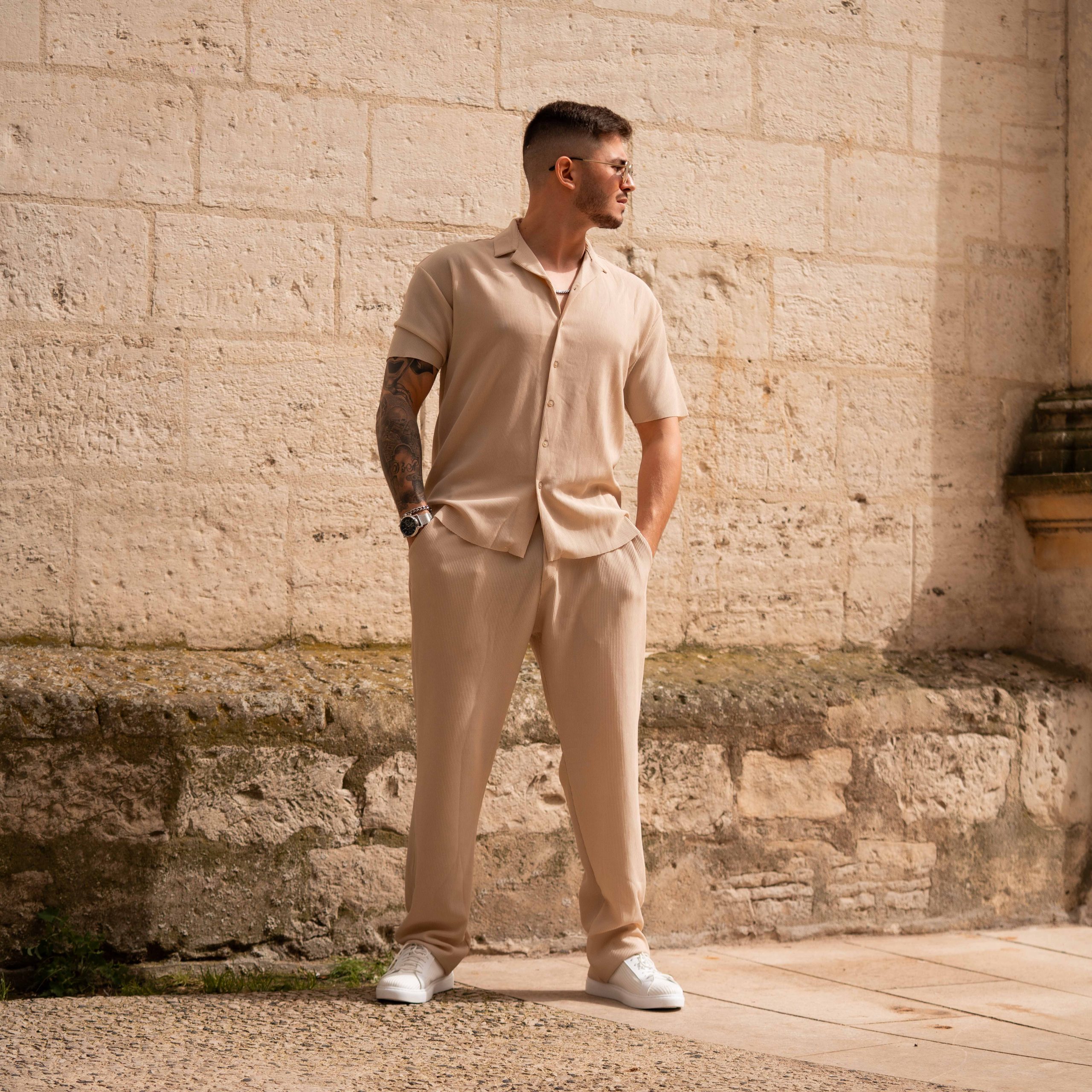 Adoptez un look chic et décontracté avec notre ensemble élégant comprenant un pantalon large et une chemisette à rayures fines. Cet ensemble beige, subtilement stylé, est idéal pour les journées ensoleillées et les sorties décontractées, tout en offrant un confort et une liberté de mouvement inégalés.
