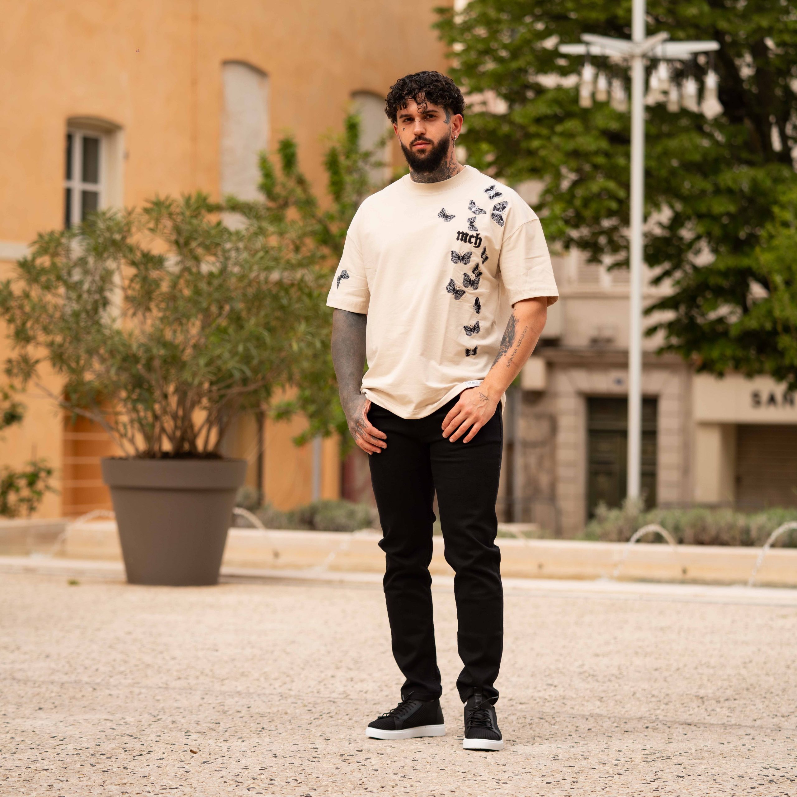 - Design avant : Sur le côté droit de la poitrine, plusieurs motifs de papillons noirs ajoutent une touche délicate et stylisée, accompagnés d’une petite inscription « mch ».