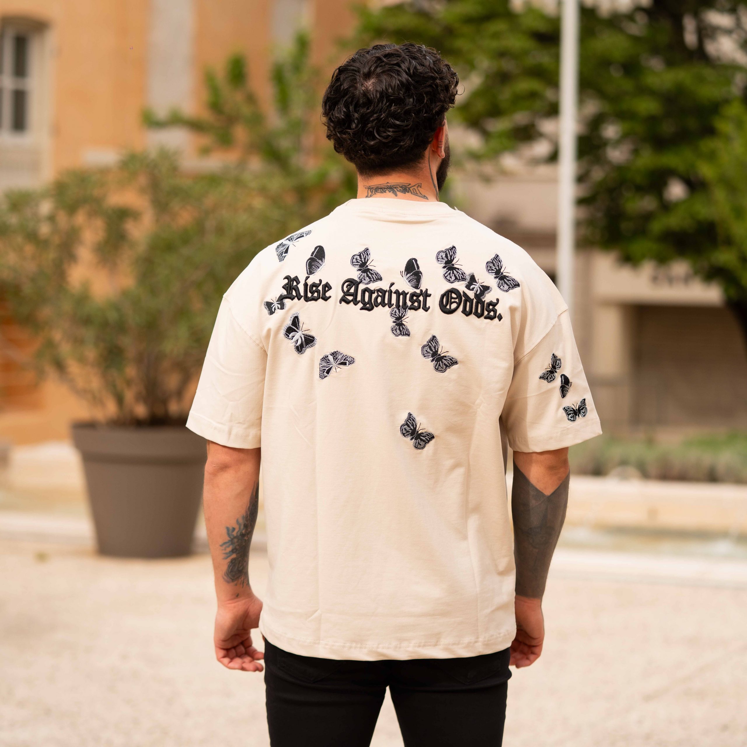 - Design arrière : Le dos du t-shirt arbore l'inscription inspirante "Rise Against Odds" en lettres noires, entourée de motifs de papillons noirs dispersés, symbolisant la résilience et la beauté.